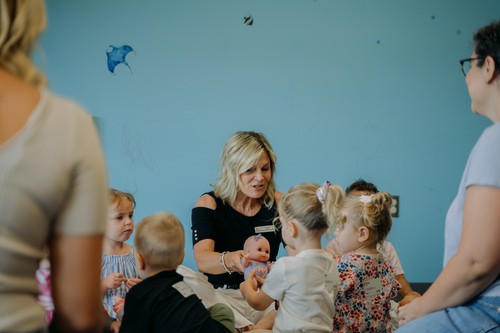 In the nurseries (one for babies & one for toddlers,) kids learn big ideas about God through rocking, playing, & singing.
